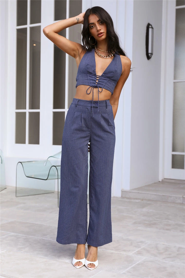 Do you feel like you’re the love child of Boss B and 90s vibes? Well, girl, we have the perfect piece for you – the Everlasting Crop. Featuring a retro-inspired stripe pattern, a tie-up halterneck, a lace-up front and an open back. Style yours with the matching pants and heels.