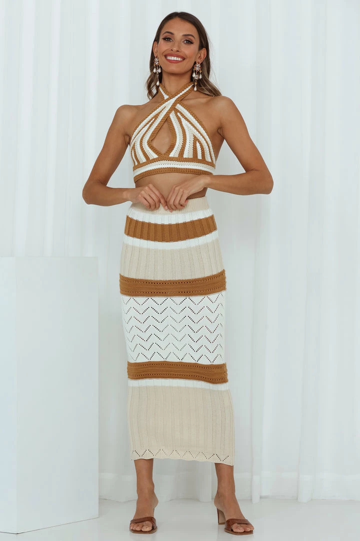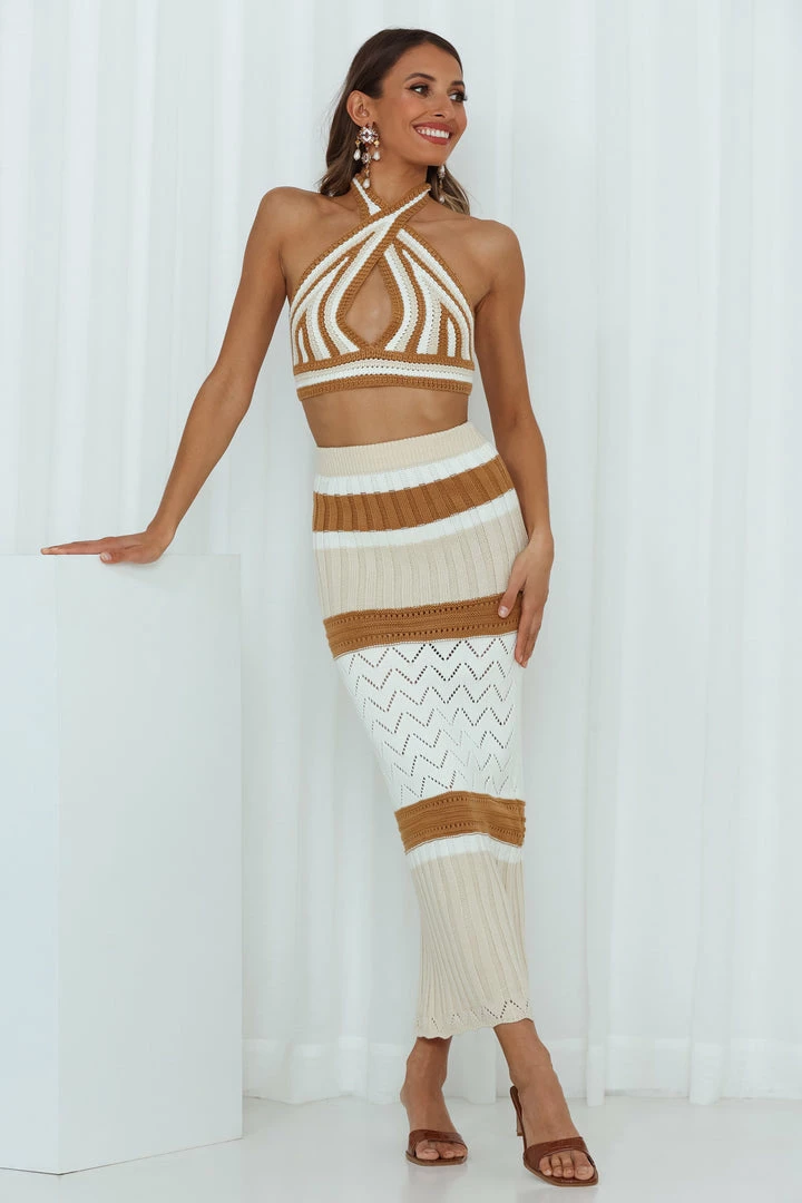We Love These Vibes that this midi is exuding. Carefree and chill with the knit fabric, unique print and its hella bodycon. Style yours with the matching crop and mules.