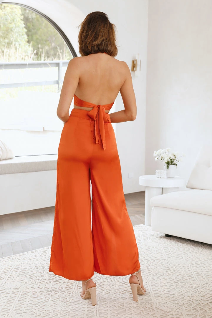 View life with some orange-hued Tinted Glasses. Glam up your life on the daily! Start with this no-brainer fit that features a crop with a plunging neckline with a ring detail, a halterneck with a tie-up back, and the pants feature a flowy fit with slits at the hemline. Style yours with mules and waves.Β