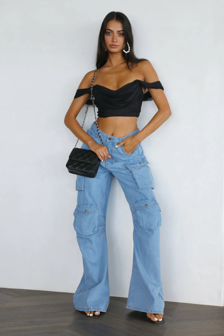 Add some edge to your next going-out ‘fit. The Belle Jeans features a high-rise with a cargo pant design, a super long length and a fun retro baggy fit. Pair yours with a crop and waves.Β
