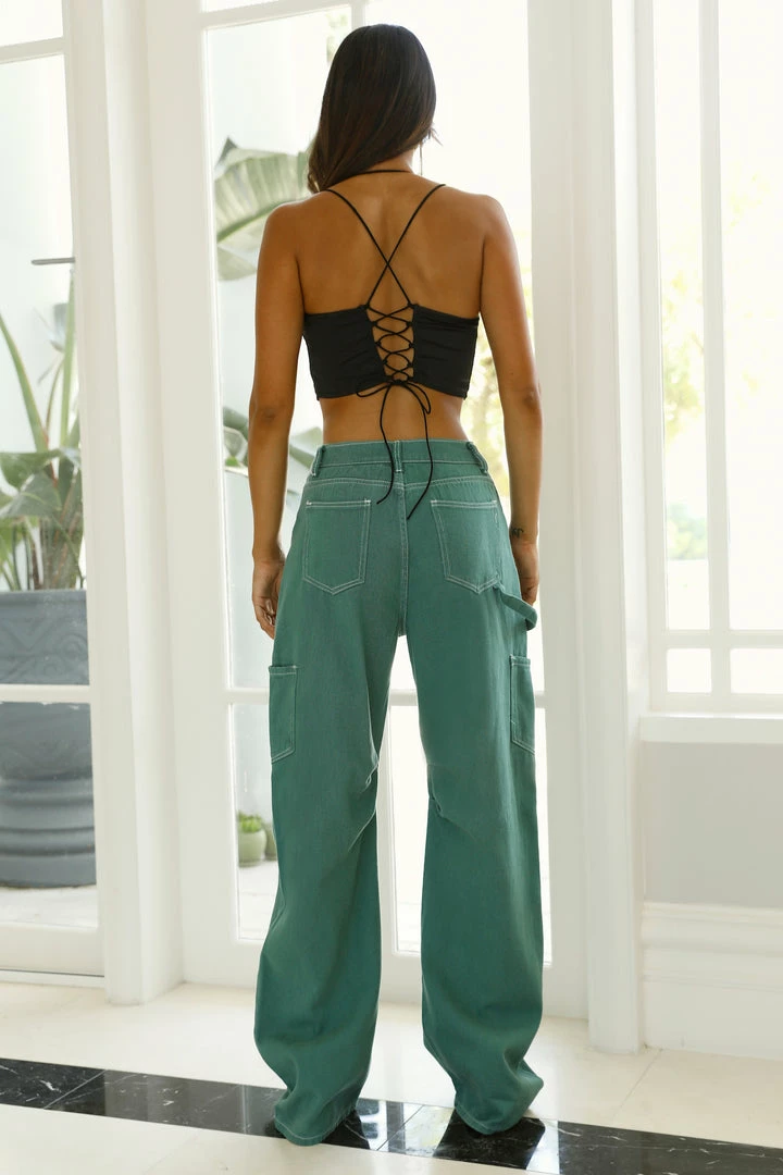 Welcome the 90s in these ultra-cute low rise baggy jeans. Shine in this stunning green hue with contrast stitching. Style yours with sneakers and a crop.Β