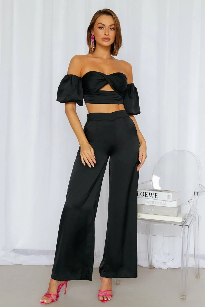 Be the sleekiest chick around with the Serena Pant. Featuring a snatched waist with wide-legged pants. Style yours with the matching crop and statement earrings.