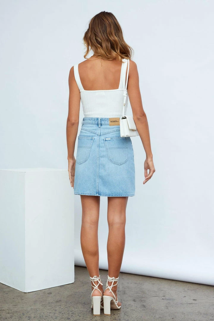 - Blue medium-wash skirt.