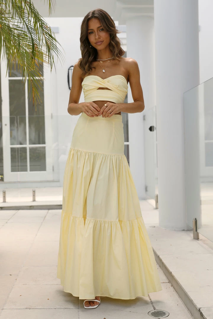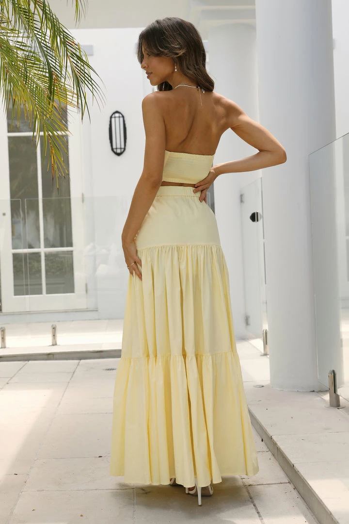 Enter the season of events in the most stunning maxi skirt. This sweet skirt has a tiered detail and gorgeous tight high waist fit, so this skirt was made for you! Complete the look with the matching crop and some white dainty heels.Β