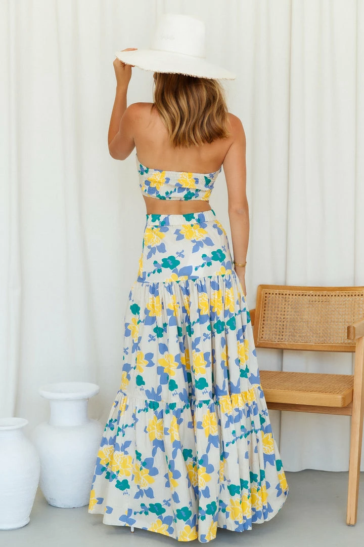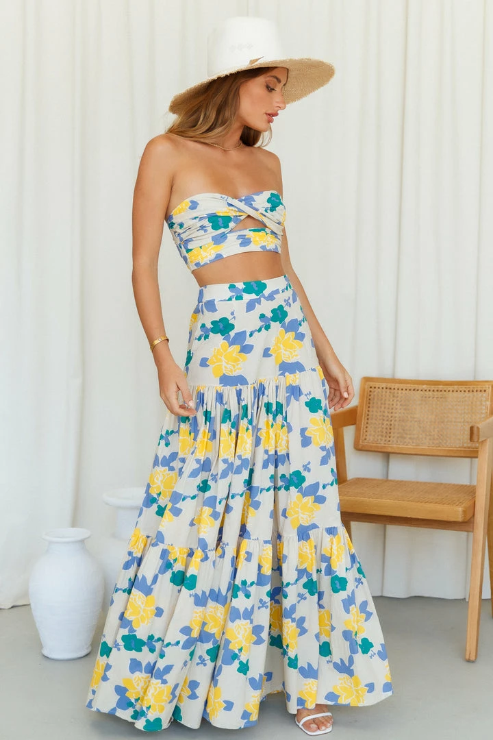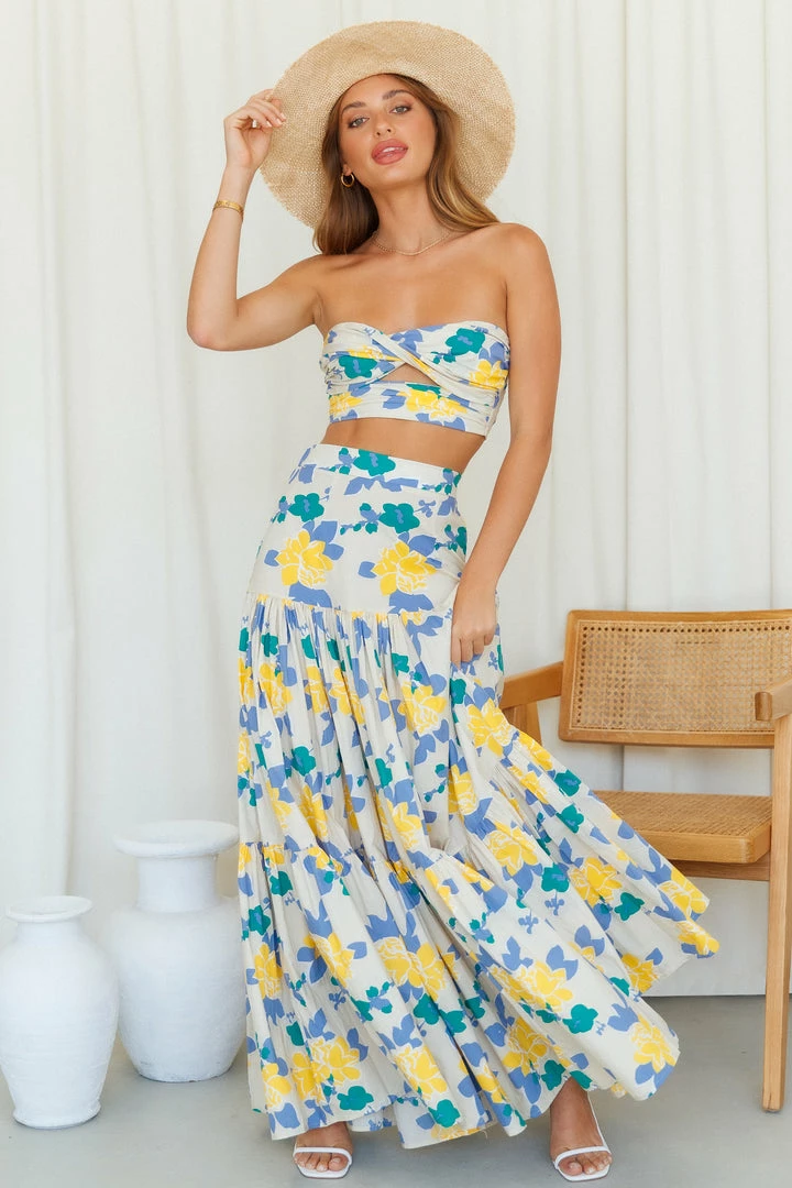 Be the cutest with this stunning strapless crop top. Featuring a twist in the bust with a cut-out right underneath, this is a major must-have. Pair this with the matching maxi and block heels.